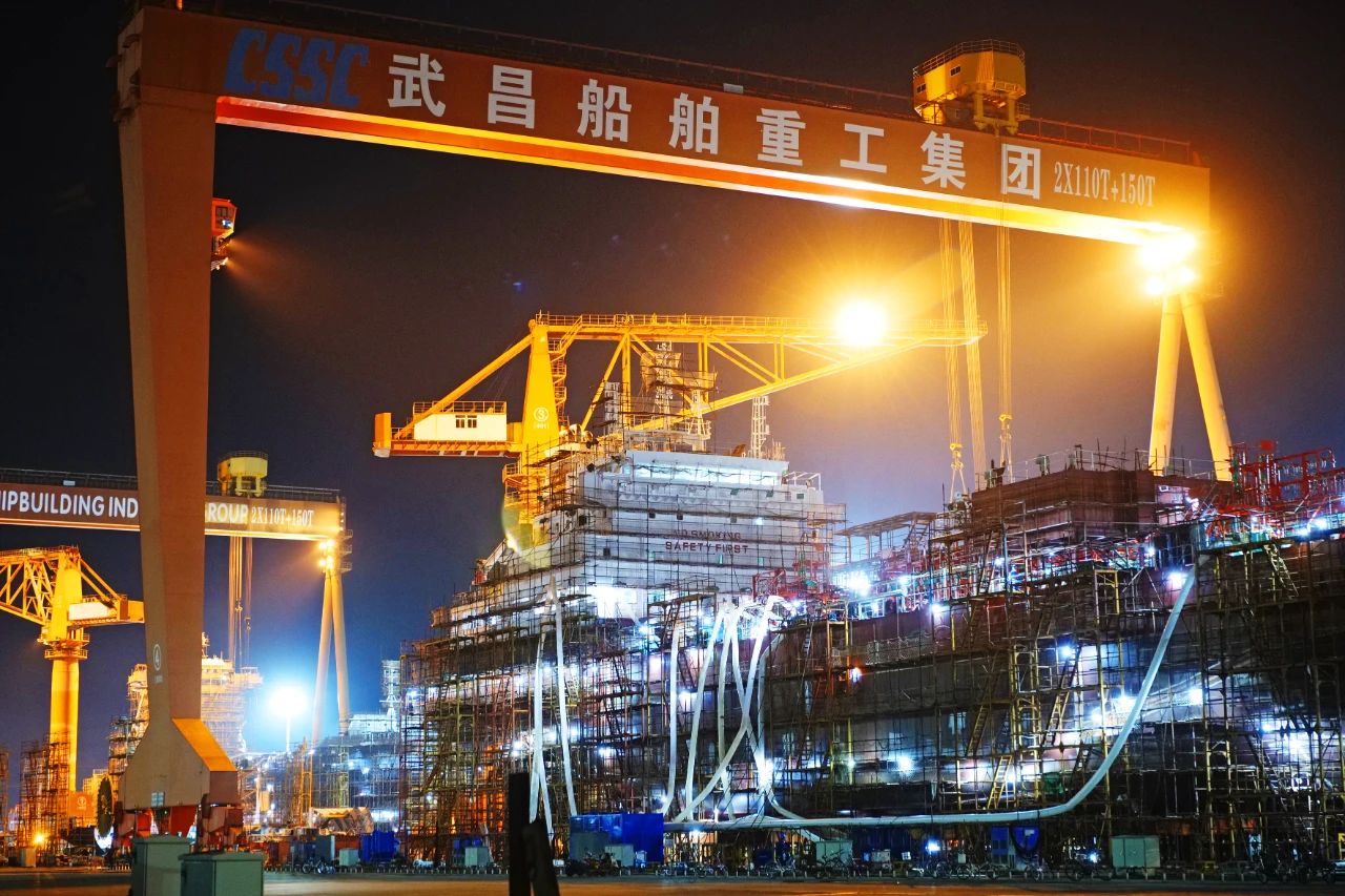 在武漢船機平臺總裝現(xiàn)場,華夏金租神大平臺配套的1200噸起重機正在安裝,大件吊裝各項準(zhǔn)備工作繁瑣,一切就緒時,天已經(jīng)黑了,現(xiàn)場一鼓作氣開始吊裝對接,展現(xiàn)了船舶人只爭朝夕、不負(fù)韶華、忘我工作精神風(fēng)貌。