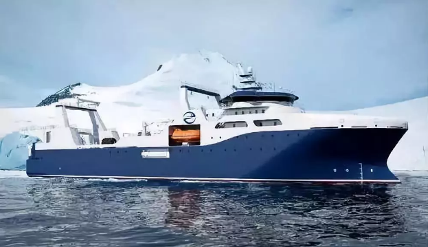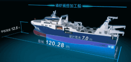 ????“深藍(lán)號”由黃埔文沖建造,七〇八所參與設(shè)計,總長約120米,型寬21.6米,設(shè)計吃水7.3米,設(shè)計航速15節(jié),主機(jī)功率8000 千瓦,載重噸約5000噸。“深藍(lán)號”是我國自主研制建造的第一艘漁業(yè)捕撈加工一體船,也是目前最大最先進(jìn)的漁業(yè)捕撈加工一體船,取得近200項知識產(chǎn)權(quán)保護(hù),實現(xiàn)了我國現(xiàn)代化漁業(yè)船舶裝備領(lǐng)域的重大突破,達(dá)到世界先進(jìn)水平;主要用于南大洋漁業(yè)捕撈,兼顧海洋科考功能,可滿足ICE-A冰區(qū)(冰厚度0.8米)及-25℃低溫環(huán)境的營運要求。