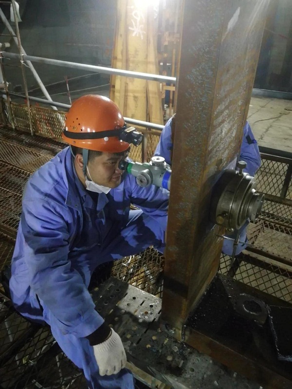 為確保VLCC照光工作順利完成,大船集團輪機工藝小組,提前一周就進入“作戰”狀態,他們每天堅持深入現場,從細小處入手,檢查每一個可能影響軸舵系施工質量的隱患,加班加點成了工作的常態。