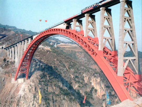 ▲1999年,研制了國內(nèi)第一臺轉(zhuǎn)體球鉸。承載力120000千牛,應(yīng)用在貴州水柏鐵路北盤江大橋,是世界上第一座上承式推力轉(zhuǎn)體式鐵路鋼管混凝土拱橋,創(chuàng)造了當(dāng)時世界之最。