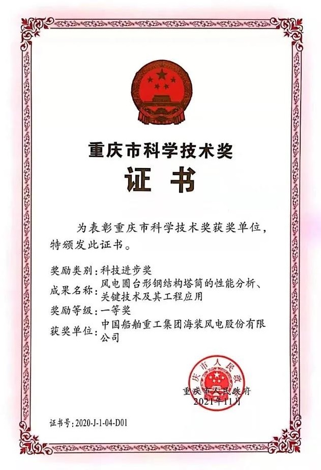 中國船舶集團(tuán)旗下中國海裝申報的兩項(xiàng)成果《高效安全大型風(fēng)電機(jī)組傳動鏈關(guān)鍵技術(shù)與應(yīng)用》《風(fēng)電圓臺形鋼結(jié)構(gòu)塔筒的性能分析、關(guān)鍵技術(shù)及其工程應(yīng)用》榮獲重慶市科技進(jìn)步獎一等獎。
