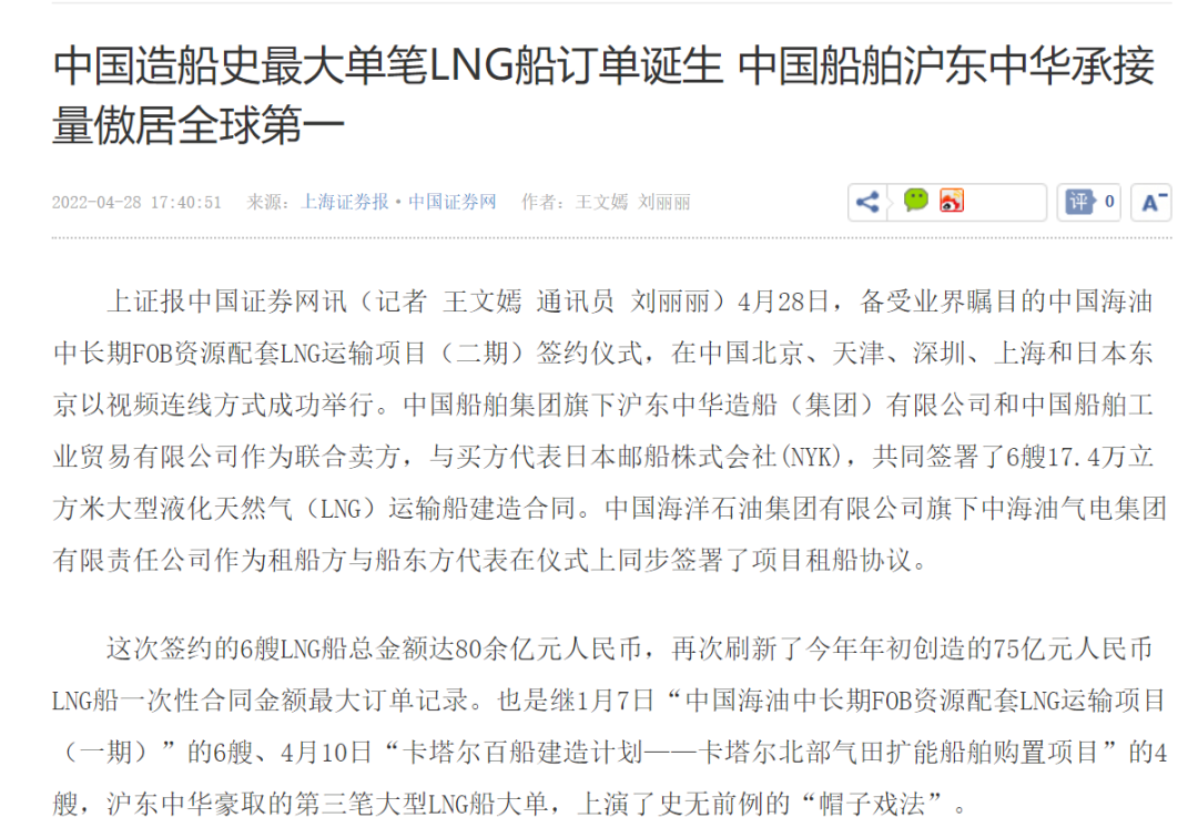 這次簽約生效的6艘LNG船總金額達80余億元人民幣,再次刷新了今年年初創造的LNG船一次性合同金額最大訂單紀錄。至此,今年前4個月滬東中華已累計承接LNG船訂單達到創歷史紀錄的17艘,超越韓國船企傲居全球之首,在實現簽單質量和數量“雙提升”的同時,進一步鞏固了滬東中華在中國LNG產業鏈的龍頭地位和領跑優勢。