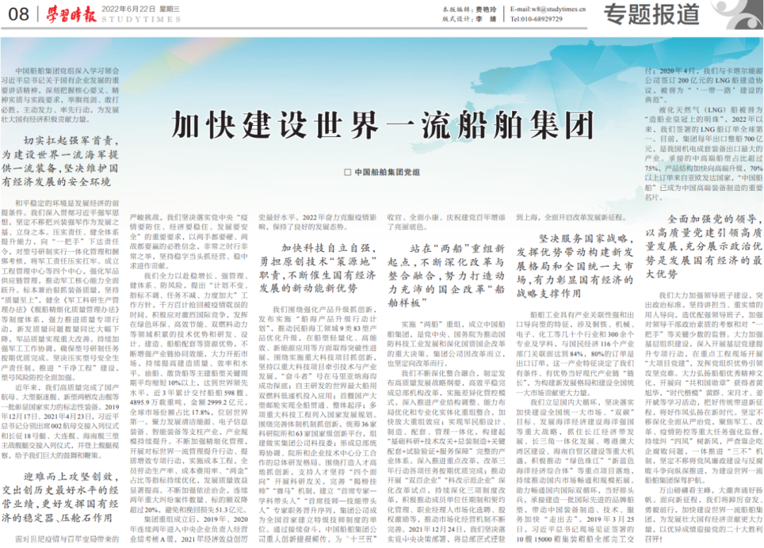 6月22日,《學習時報》發表中國船舶集團黨組署名文章《加快建設世界一流船舶集團》,萬山磅礴看主峰,大潮奔涌好揚帆,面向新征程,中國船舶集團將踔厲奮發、勇毅前行,為發展壯大國有經濟貢獻更大力量,以優異成績迎接黨的二十大勝利召開。