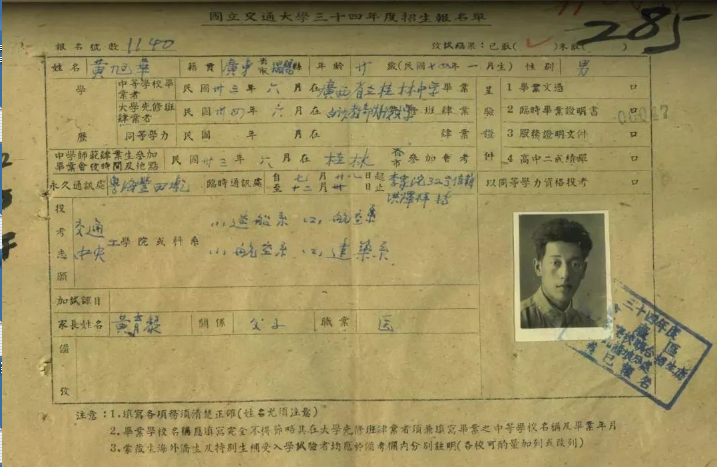“國立交通大學(xué)”這所當(dāng)時在科學(xué)技術(shù)領(lǐng)域全國首屈一指的學(xué)術(shù)殿堂,在黃旭華心中是神圣而遙遠(yuǎn)的。以至于當(dāng)真正有機(jī)會填寫被保送大學(xué)的名字時,他竟然沒有勇氣填上“國立交通大學(xué)”的名字,只填上了一個中央大學(xué)的航空系。