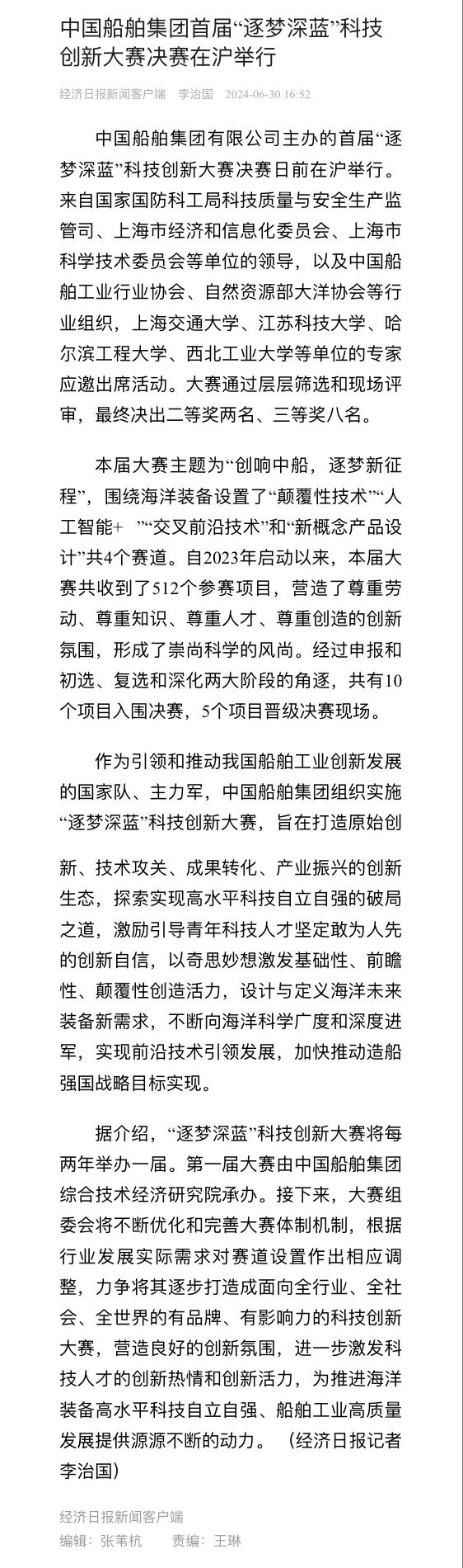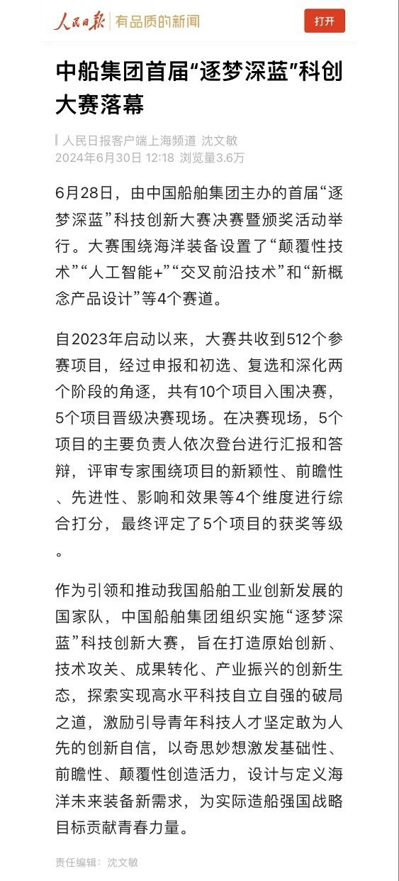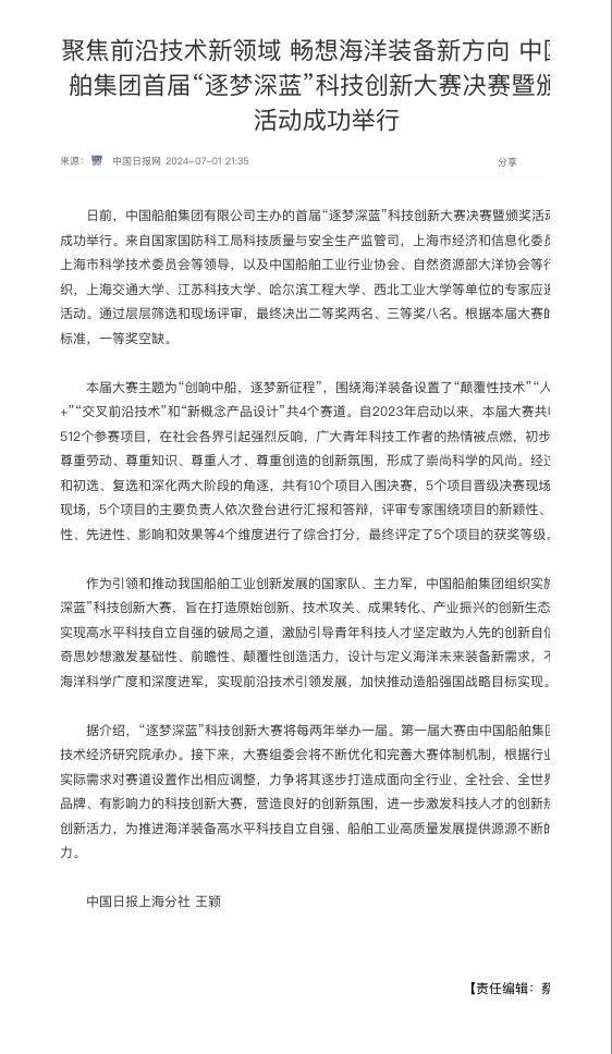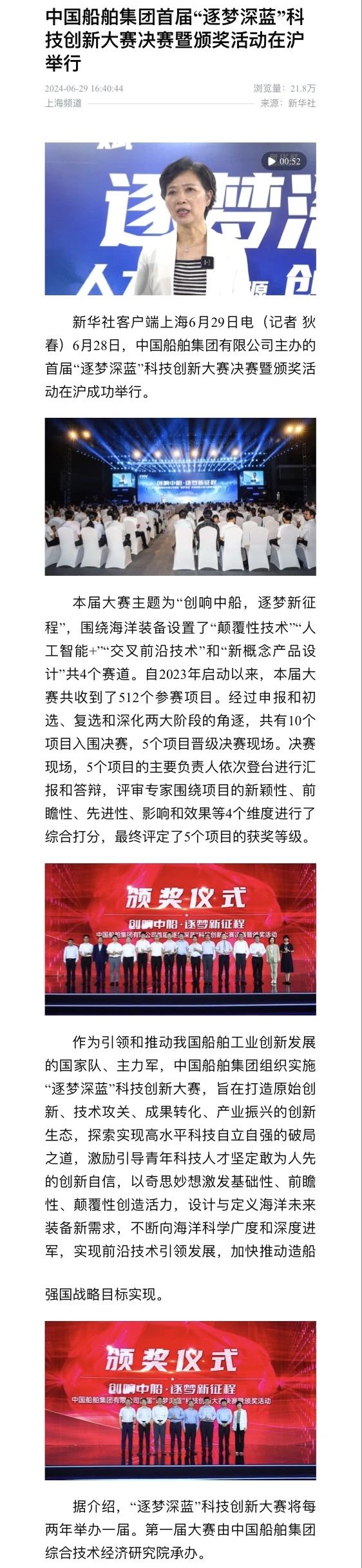 中國船舶集團(tuán)有限公司主辦的首屆“逐夢深藍(lán)”科技創(chuàng)新大賽決賽暨頒獎活動引來各大媒體的關(guān)注,獲得高度評價(jià)。——>活動回顧