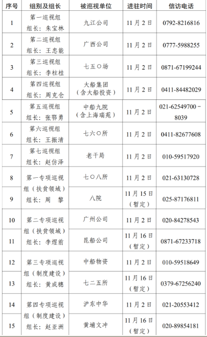根據(jù)中國船舶集團(tuán)黨組對2020年第二輪巡視工作的統(tǒng)一部署,截止11月2日,集團(tuán)公司黨組7個常規(guī)巡視組已全部完成進(jìn)駐,對九江公司、廣西公司、七五〇場、大船集團(tuán)(含大船投資)、中船九院(含上海瑞苑)、七六〇所、老干局等7家單位開展常規(guī)巡視。集團(tuán)公司黨組4個專項(xiàng)巡視組采取“一托二”方式同步對七〇八所、八院、廣州公司、昆船公司、中船物資、七二五所、滬東中華、黃埔文沖等8家單位開展扶貧領(lǐng)域、制度建設(shè)專項(xiàng)巡視,4個專項(xiàng)巡視組目前均已進(jìn)駐首家被巡視單位。